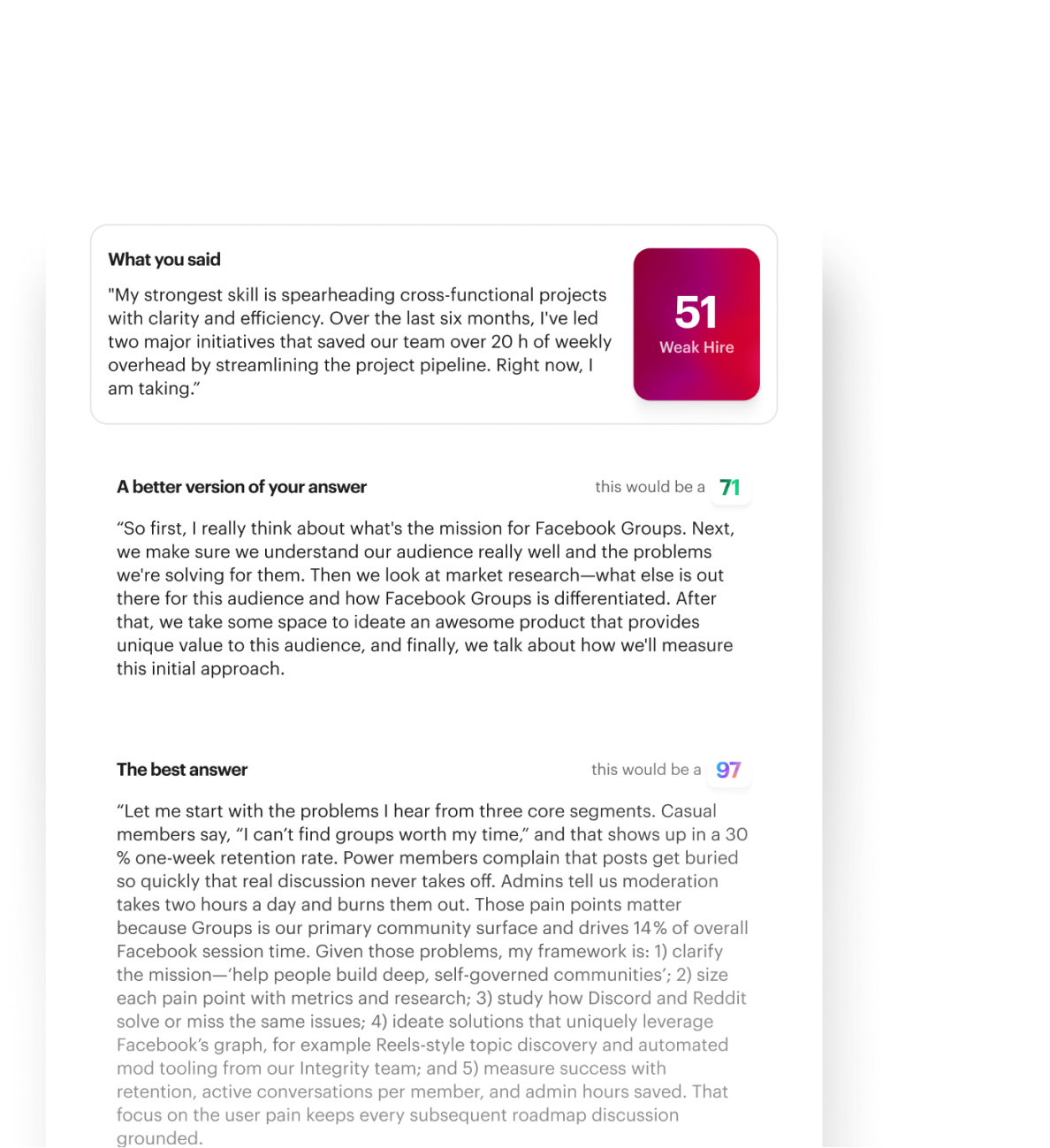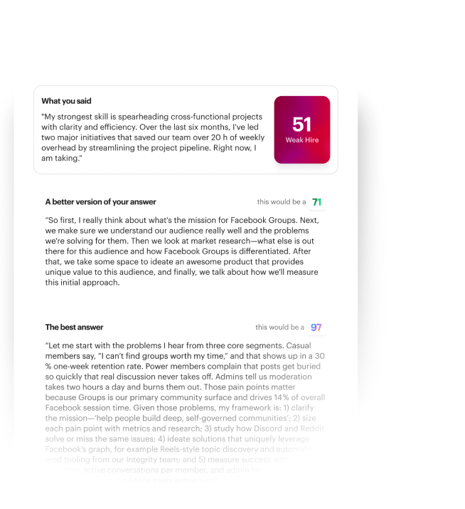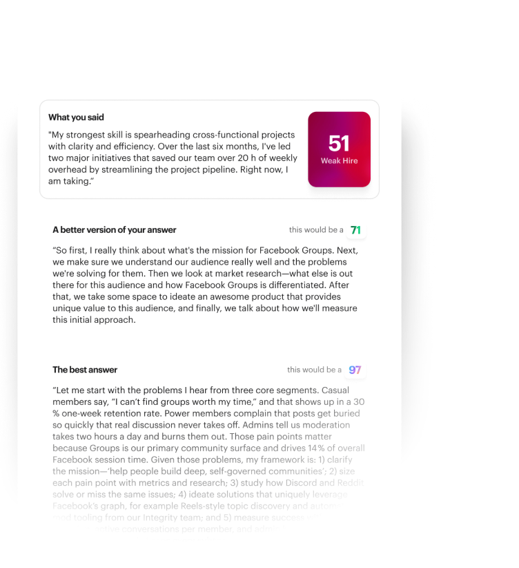 “A behavioral boot camp in your pocket. You tell your stories, and the tool listens, picks up on your pacing, key words, structure, where you stumble, and then tells you, ‘Hey, tighten that story here, add data there.’ It's real-time coaching, not just question practice.”