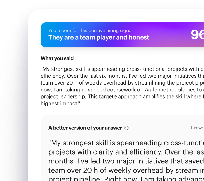 Prep for high-stakes interviews using AI trained by hiring experts to sharpen your story, gain confidence, and break through the final round.